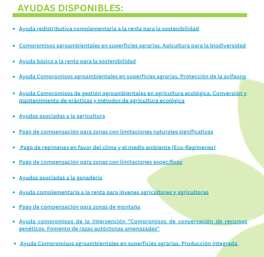 A trav茅s de esta convocatoria se articulan las distintas l铆neas de ayuda, entre las que se incluyen los pagos directos desacoplados, los ecorreg铆menes, las ayudas asociadas a determinados sectores productivos y las intervenciones de desarrollo rural.聽
